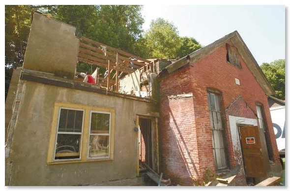 Chris Adams, and Scott Harper of Marshalls Creek demolish the second floor of the parsonage addition to the Little Bethel Church in Stroudsburg on Wednesday. The addition was added in the late 1950s and it's destruction will help make way for the reconstruction of the original church's roof.
